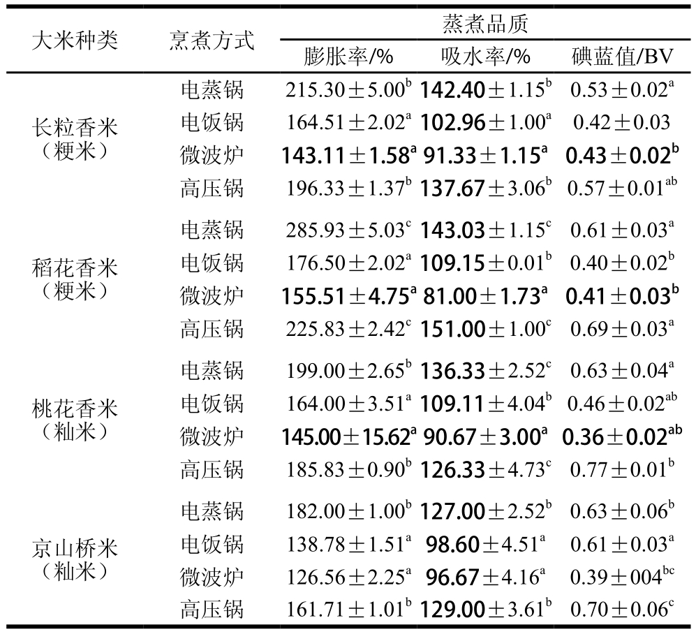 注:同列肩标小写字母不同表示同种大米不同烹煮方式下各指标差异显著(P<0.05)。下同。