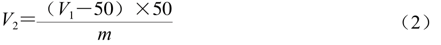 将一定质量的原料米做成米饭(总质量m),从中取50 g米饭装入100 mL量筒内,注入50 mL水后立即测定体积(V1),则50 g米饭体积(V2)按式(2)计算。