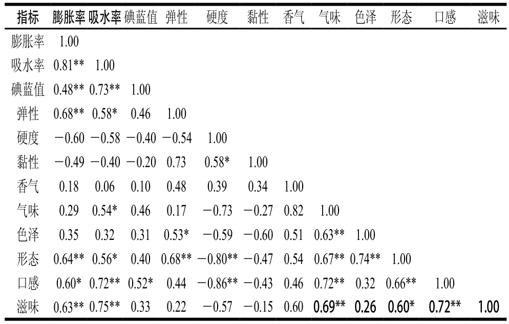 米饭食味品质的评定,主要通过感官评价法和指标评价法,两种方法之间具有一定的相关性[31]。从表7相关性分析可以看出,碘蓝值与吸水率和膨胀率呈极显著正相关(P<0.01),且三者均与口感、滋味呈显著正相关(P<0.05,P<0.01),膨胀率还与米饭弹性及形态呈极显著正相关(P<0.01),即米饭的膨胀率大、饭粒外观完整性高、弹性大、受损颗粒比例少、口感好。质构仪所测米饭硬度与感官评价指标均呈负相关,即米饭硬度越大,口感越差,米饭颗粒外部形态越差,米饭的弹性与米饭口感呈正相关,弹性与米饭形态和色泽呈显著正相关(P<0.01,P<0.05)。米饭的形态、口感与米饭的气味和滋味呈显著正相关(P<0.05,P<0.01),由此可见,米饭香气也是米饭食味品质的一个重要评价指标。