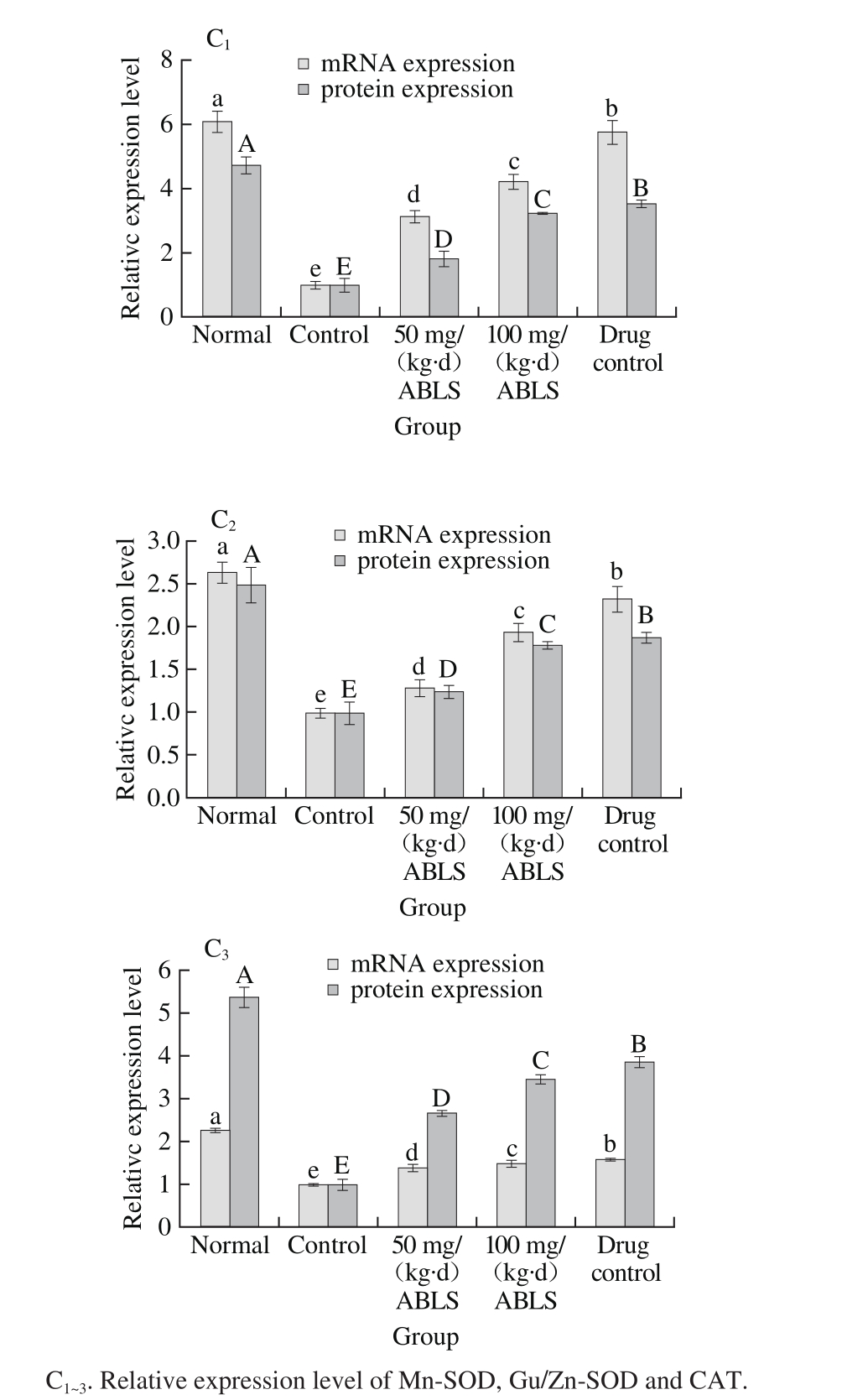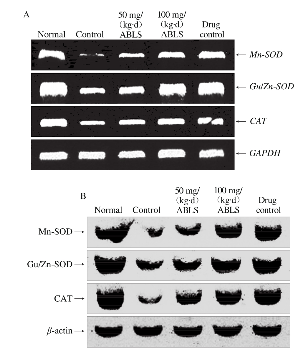 Nomal mice had the highest mRNA and protein expression levels Mn-SOD, Gu/Zn-SOD and CAT, and ABLS-, ranitidinetreated mice showed the higher mRNA and protein expression levels of Mn-SOD (4.22 folds mRNA expression, 3.22 folds protein expression), Gu/Zn-SOD (1.98 folds mRNA expression, 1.55 folds protein expression) and CAT (1.49 folds mRNA expression, 3.44 folds protein expression) than those of mice in control group (Fig. 4). The high concentration ABLS (100 mg/(kg·d)) treatment could raise expression levels of Mn-SOD, Gu/Zn-SOD and CAT as compared to those of mice in the 50 mg/(kg·d) ABLS group. Under the stimulus of ethanol, gastric mucosa released a large amount of oxygen free radicals, among which, OH is highly poisonous[31]. In addition, the content of xanthine dehydrogenase was much higher in the stomach than in the other tissues. When gastric mucosa is stimulated by ethanol, therefore, there is intense oxidative reaction in thestomach. SOD, the most important antioxidant enzyme which resists free radicals, is mainly composed of Cu/Zn-SOD and Mn-SOD. Both Cu/Zn-SOD and Mn-SOD can reduce the oxidation led injury[32]. Hydrogen peroxide is a metabolic waste which injures the organism. To avoid the injury, it must be quickly transformed to other harmless or less poisonous molecules. CAT is usually used to catalyze its decomposition. There is a significant increase in the level of hydrogen peroxide when gastric mucosa is injured. A high level of CAT can alleviate the injury by scavenging hydrogen peroxide[3].
