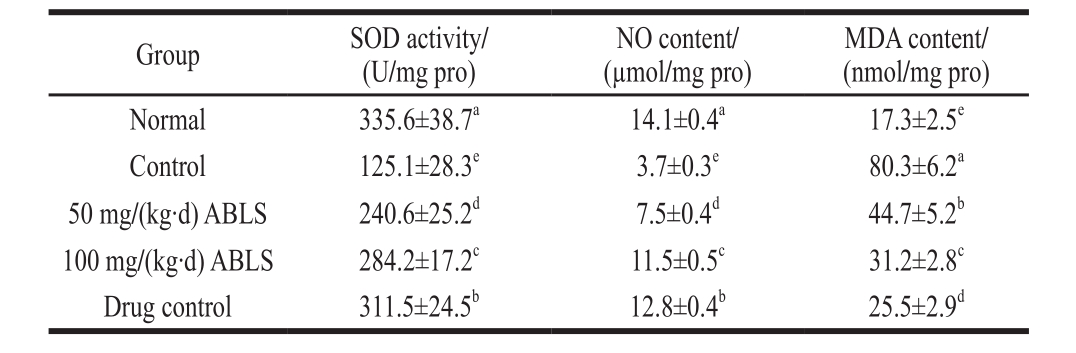 Table 5 Effect of ABLS administration on the levels of SOD, NO and MDA in gastric tissues of mice with HCl/ethanol-induced gastric mucosal injury