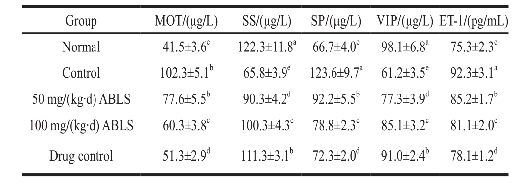 Table 4 Effect of ABLS administration on serum levels of MOT, SS, SP, VIP and ET-1 in mice with HCl/ethanol-induced gastric mucosal injury