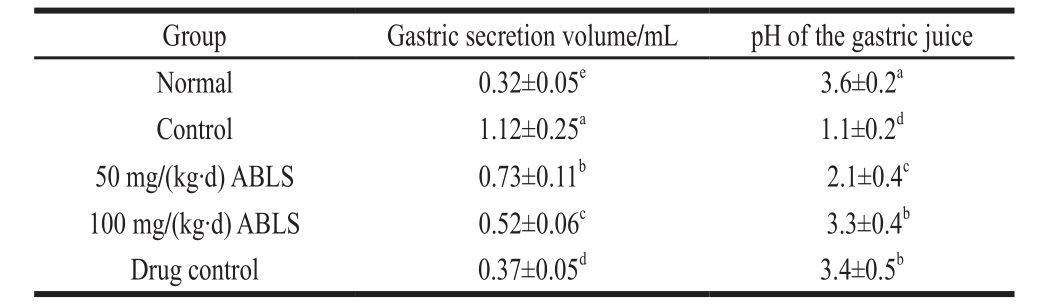 Mice were divided into 5 groups with 10 mice in each group. In the first 30 days, the mice in normal and control groups were administered with only distilled water (0.1 mL/(10 g·d), based on body weight, the same below) by intragastric administration; the ABLS groups were treated with two concentrations (50 and 100 mg/(kg·d)) of ABLS and the mice in drug control group (ranitidine) were treated with 50 mg/(kg·d) ranitidine by intragastric administration. At the 30thday post treatment, all mice were fasted for 12 h. The mice of ABLS and drug control groups were treated by intragastric administration of HCl/ethanol (60% in 150 mmol/L HCl, 10 mL/kg) gastric mucosal injury inducement reagent, then all the mice were sacrificed after 1 h under deep ether anesthesia. The gastric mucosal injury area (mm2) of stomach was observed under a digital camera and the images were analyzed by ImageJ software. Gastric juice pH was measured using a pH meter following a 10-times dilution. The mouse blood was centrifugalized (4 000 r/min, 10 min), then the serum was collected.