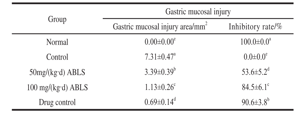 Ethanol-induced gastric mucosal injury can be determined by observing the damaged area of gastric wall[11]. In this study, ABLS reduced the damaged area of gastric mucosa and alleviated the influence of ethanol. The control, ABLS and ranitidinetreated mice were injured by HCl/ethanol. The gastric mucosal injured area of control group mice was highest (Table 1, Fig. 1); ABLS could reduce the injury area, and the 100 mg/(kg·d) ABLS treated mice showed a lower injury area close to that of drug (50 mg/(kg·d) ranitidine) treated mice. The 100 mg/(kg·d) ABLS and 50 mg/(kg·d) ranitidine treated mice also showed higher inhibitory rates (84.5 and 90.6%) on gastric mucosal injury.