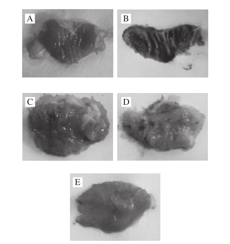 Fig. 1 Photographs of stomach of mice with HCl/ethanol-induced gastric mucosal injury treated with ABLS