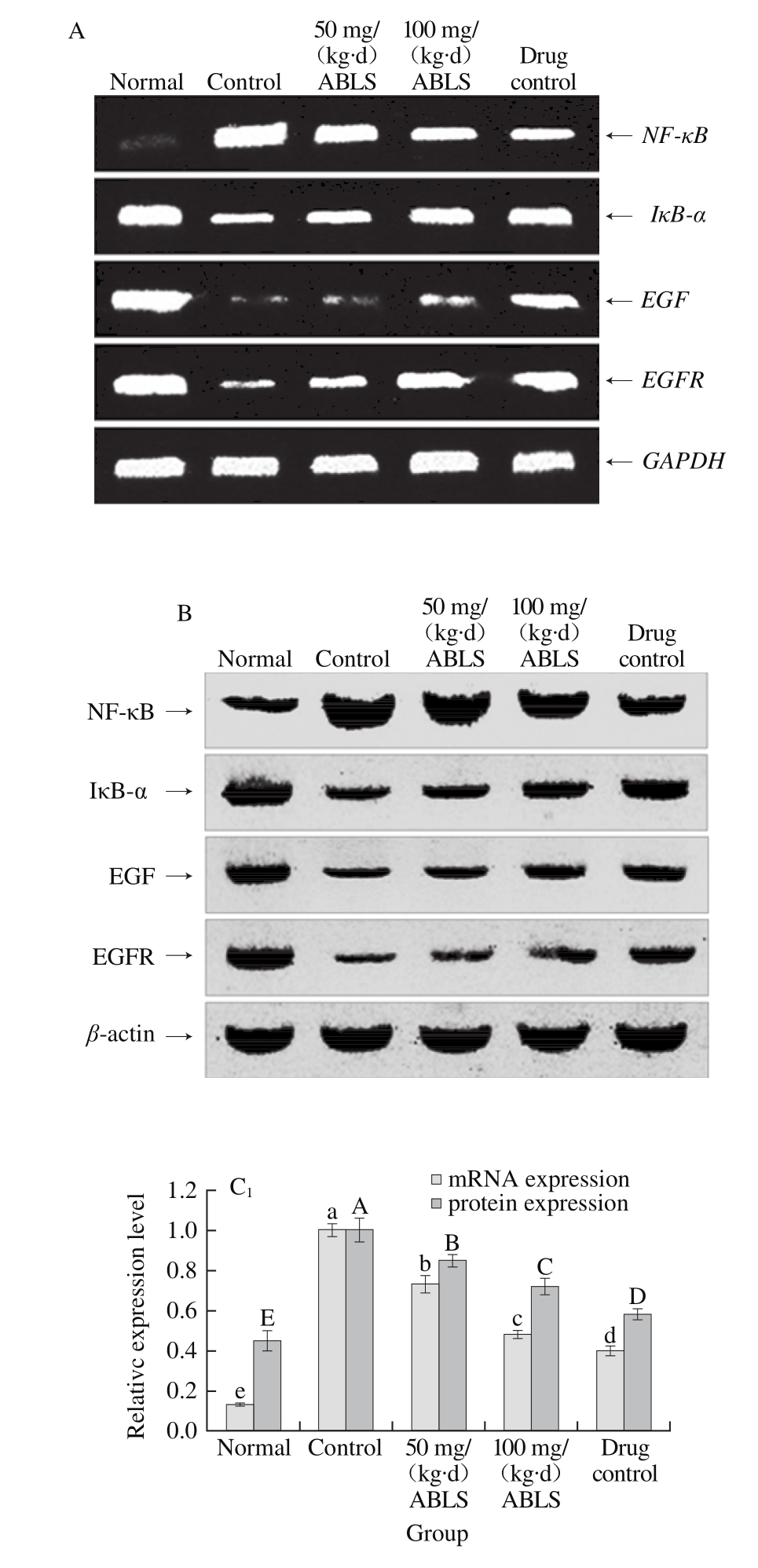 Fig. 2 Effect of ABLS administration on mRNA and protein expression levels of NF-κB, IκB-α, EGF and EGFR in mice with HCl/ethanolinduced gastric mucosal injury