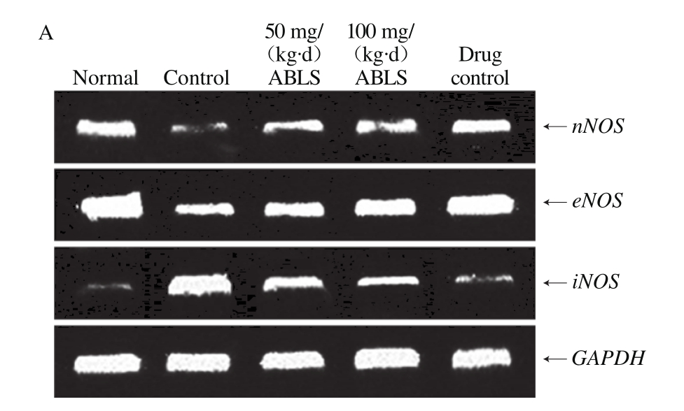 The mRNA and protein expression levels of nNOS and eNOS in gastric tissues of normal mice were the highest in all group, and these expression levels in mice of control group were lowest (Fig. 3). The iNOS expression in gastric tissue of mice in normal group was lowest and highest in mice of control group. After 100 mg/(kg·d) ABLS treatment, nNOS (2.08 folds mRNA expression, 1.90 folds protein expression)and eNOS (1.54 folds mRNA expression, 1.88 folds protein expression) were raised, and iNOS (0.39 folds mRNA expression, 0.58 folds protein expression) was reduced as compared to those of the control group. These expressions levels in ABLS-treated mice were close to those of mice in the ranitidine and normal groups. NO content in organism is mainly regulated by NOS. NOS in gastric mucosa is divided into two types. One type is inherent NOS which relies on Ca2+(cNOS, including nNOS and eNOS), and the other is inducible NOS which does not rely on Ca2+(iNOS)[28]. cNOS is distributed in nerve cells and endothelial cells. It has stable activity and continuously releases a small amount of NO to protect gastric mucosa. iNOS is not expressed in cells under normal state, but is expressed and continuously releases a large amount of NO when gastric mucosa is injured. Excessive NO can form peroxynitrite with oxygen free radicals and cause lipid peroxidation damage, which is a key cause for gastric mucosal injury[29]. Overinhibition of cNOS and elevation of iNOS activity are closely related with gastric mucosal injury. The injury can be effectively relieved by decelerating the reduced cNOS expression and inhibiting the enhanced iNOS expression[30]. In this study, ABLS helps inhibit gastric mucosal injury.