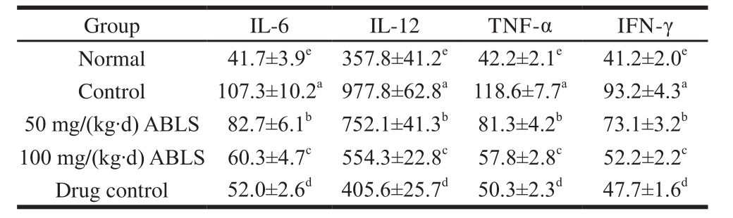 Table 3 Effect of ABLS administration on serum levels of cytokine IL-6, IL-12, TNF-αand IFN-γin mice with HCl/ethanol-induced gastric mucosal injury pg/mL