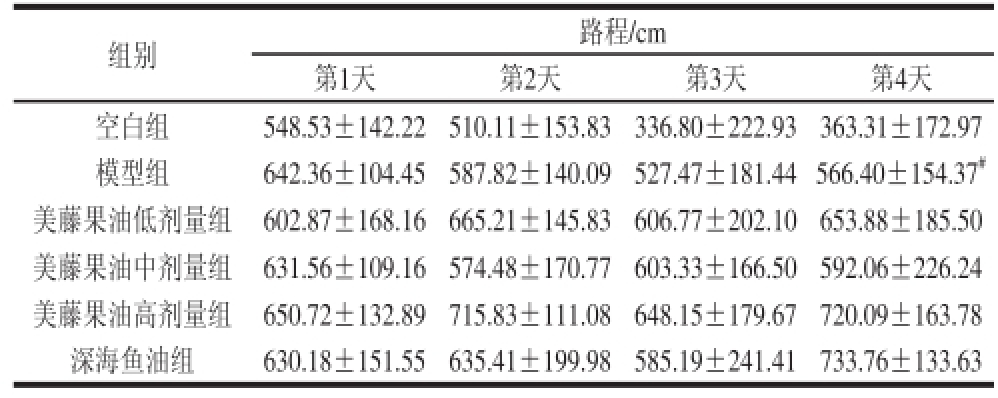 表4 美藤果油对小鼠Morris水迷宫定向航行游泳总路程的影响(n=12)