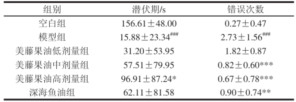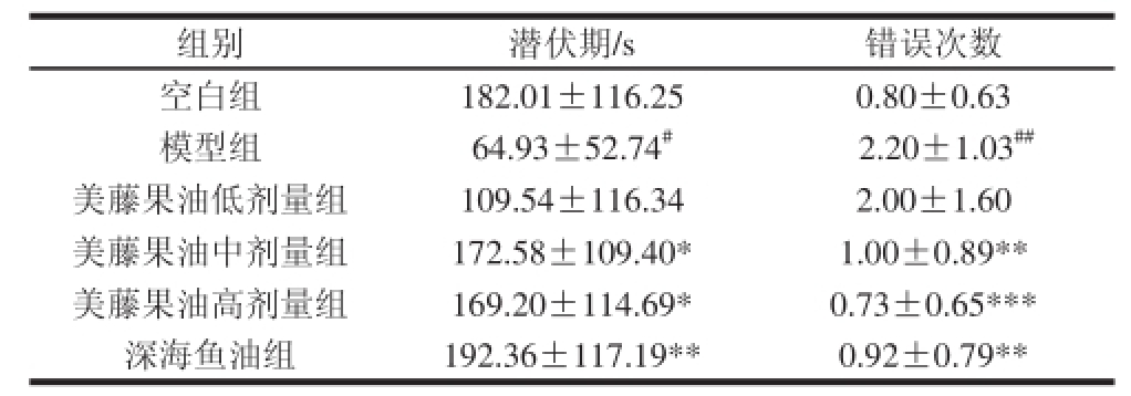 由表2可知,与空白组相比,模型组小鼠跳下平台的潜伏期高度显著缩短(P<0.001),错误次数高度显著增加(P<0.001),提示模型组小鼠学习记忆能力下降。与模型组相比,美藤果油高剂量组潜伏期显著延长(P<0.05),错误次数高度显著减少(P<0.001);美藤果油中剂量组和深海鱼油组错误次数极显著减少(P<0.001,P<0.01)。