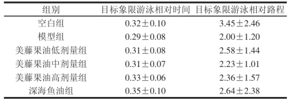 表5 美藤果油对小鼠Morris水迷宫空间探索目标象限游泳相对时间、路程的影响(n=12)
