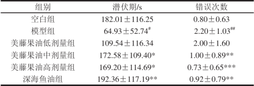 由表1可知,与空白组相比,模型组小鼠进入暗室的潜伏期显著缩短(P<0.05),错误次数极显著增加(P<0.01),提示模型组小鼠学习记忆能力下降。与模型组相比,美藤果油中、高剂量和深海鱼油组潜伏期显著延长(P<0.05,P<0.01),错误次数极显著减少(P<0.01,P<0.001)。