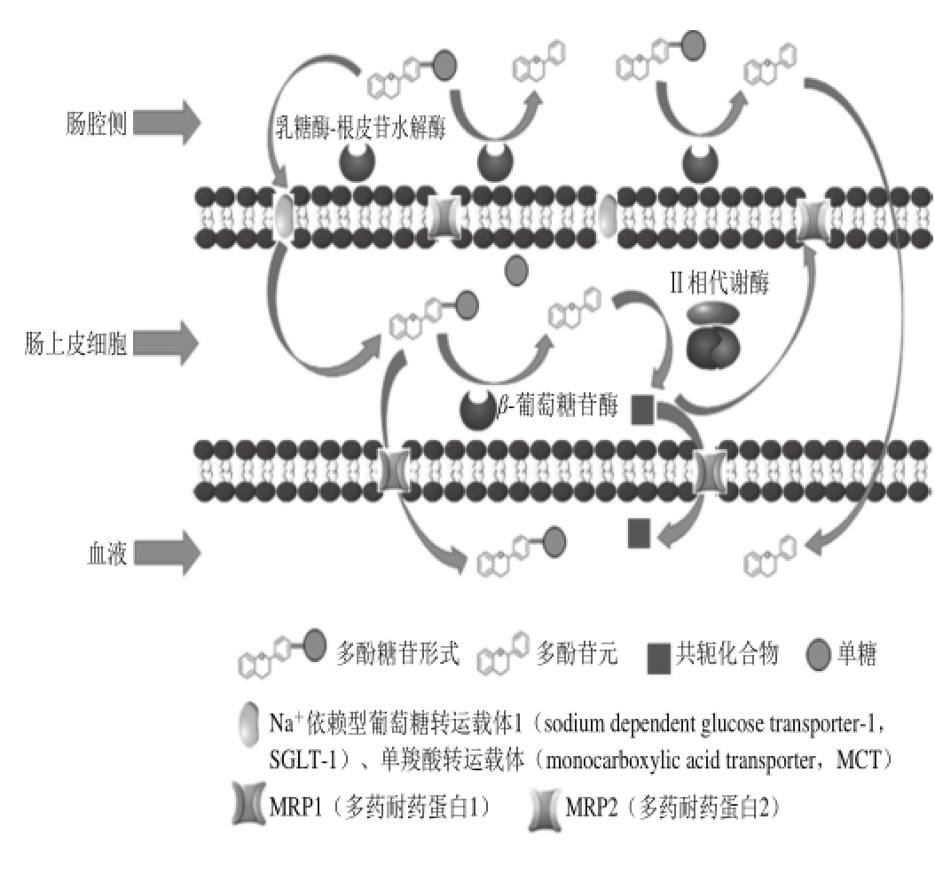 膳食多酚吸收后进入血液循环之前,会受到Ⅰ相和Ⅱ相代谢酶作用,一部分进入血液循环,另一部分被外排转运体泵回肠腔。大量研究表明,许多代谢物比它们的前体具有更活跃的生物功能[38]。