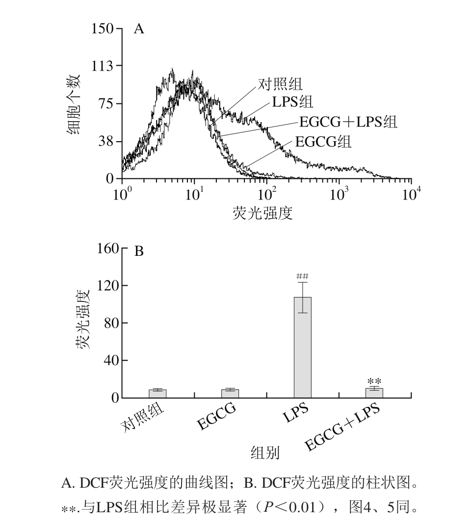 由图3可知,1 μg/mL LPS刺激小鼠腹腔巨噬细胞能使细胞内ROS含量显著上升,与对照组相比有明显差异(P<0.01)。对照组荧光强度为8.79±1.41,LPS(1 μg/mL)的刺激后明显升高到106.98±17.27。在EGCG(25 µmol/L)预处理后加入LPS(1 μg/mL)刺激,与LPS组相比,小鼠腹腔巨噬细胞内ROS含量明显降低(P<0.01),DCF荧光强度为10.68±2.59。实验结果表明,EGCG能极显著降低LPS刺激活化的小鼠腹腔巨噬细胞内产生的ROS。
