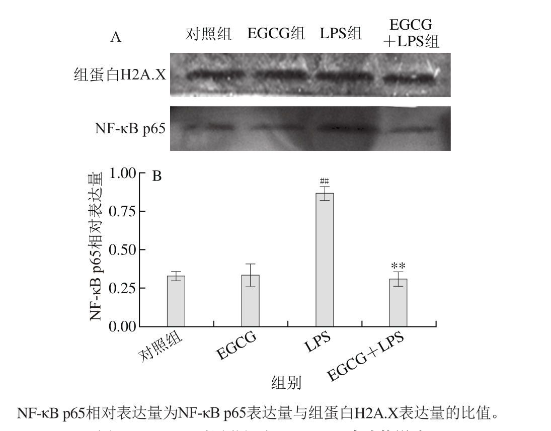 NF-κB信号转导通路,在巨噬细胞的炎症免疫反应中发挥重要的信号级联作用。LPS与TLR4结合后,激活NF-κB信号转导通路,促进炎症因子的释放,介导炎症反应[17]。Western blot实验结果如图5所示,与对照组相比,LPS组中小鼠腹腔巨噬细胞细胞核蛋白中NF-κB p65表达量显著增加;LPS处理巨噬细胞前,加入EGCG预处理24 h,极显著降低LPS介导的NF-κB p65蛋白表达的上调(P<0.01)。与此同时EGCG单独处理巨噬细胞后,与对照组比较,巨噬细胞中NF-κB p65蛋白的表达无显著变化。这说明EGCG抑制LPS介导的炎症,与可通过抑制NF-κB通路的激活有关。