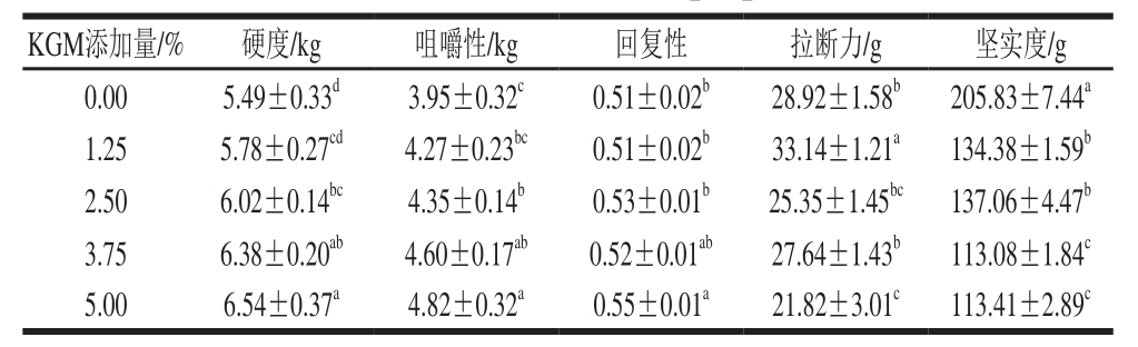 表1 不同KGM添加量对面条质构性质的影响