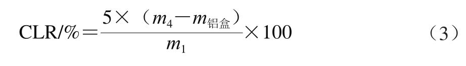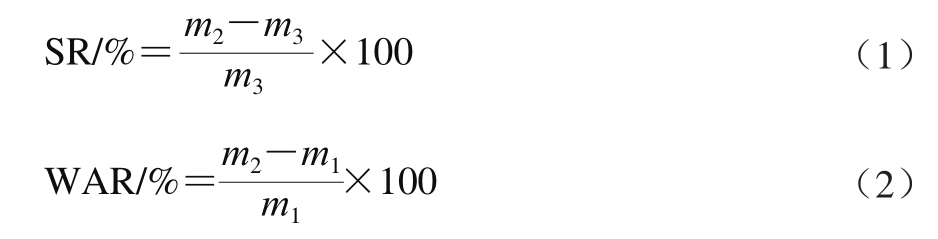 烹煮实验参照文献[1]进行。称取一定量干面条(m1/g),放入500 mL沸水中煮5 min,煮后用漏勺捞出沥干,静置10 min,称质量(m2/g),称量后的面条置于105 ℃干燥箱烘至恒质量(m3/g);面汤冷却至室温后用蒸馏水定容至500 mL,量取100 mL面汤倒入已称质量的铝盒(m铝盒/g)中,将铝盒置于105 ℃干燥箱烘至恒质量(m4/g)。面条的膨胀率(swelling rate,SR)、吸水率(water absorption rate,WAR)、烹煮损失率(cooking losses rate,CLR)分别按公式(1)~(3)计算。