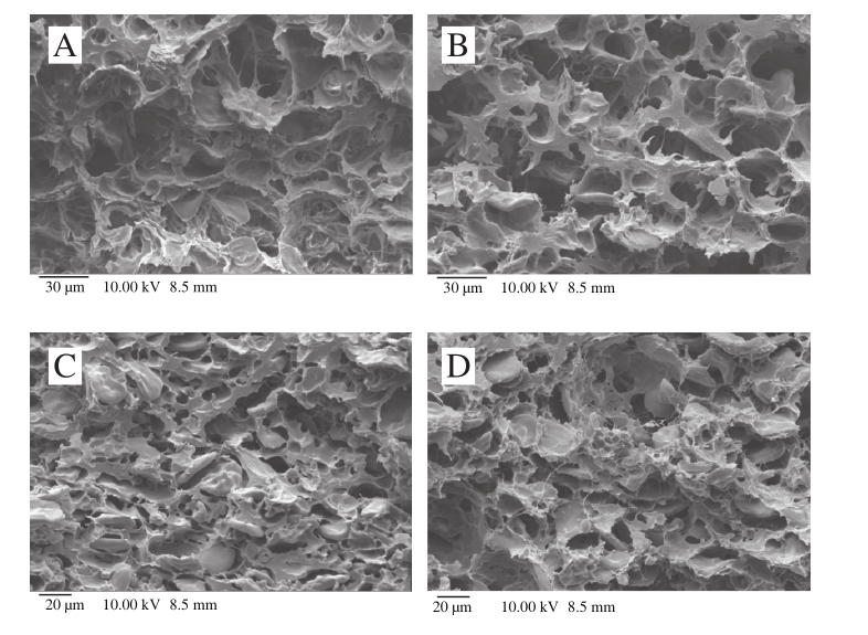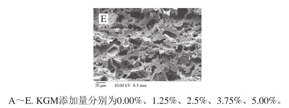 图2为KGM对面条煮后微观结构影响的扫描电子显微镜图。图中的孔洞是面条贮藏水分的地方,面条冻干以后,水分挥发形成孔洞。面筋蛋白相互交联形成网状结构。与对照组(图2A)相比,添加KGM的面条(图2B~E)的微观空隙随着KGM添加量增加而逐渐变小,面筋蛋白网络结构更加致密,这与TPA实验测得的硬度变化趋势一致。面条煮后,KGM空间构象变得伸展,在网状结构之间出现丝状物。此外,经过相同烹煮过程,添加KGM的面条中可见未完全糊化的淀粉颗粒,这是因为KGM与淀粉相互缠结抑制了淀粉吸水而进一步的糊化作用,这与面条剪切实验得到的坚实度降低相一致。