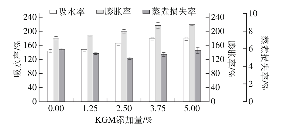 烹煮性质是评价面条品质的一个重要指标。通常使用烹煮损失率来表征面条的烹煮性质;此外,吸水率可以表征面条中淀粉和蛋白质的水合程度[22]。传统制作的面条的吸水率与淀粉糊化和面筋网络膨胀有关。从图1可见,随着KGM添加量的增加面条吸水率和膨胀率升高,这是因为KGM含有大量亲水基团,可吸附大量的自由水。