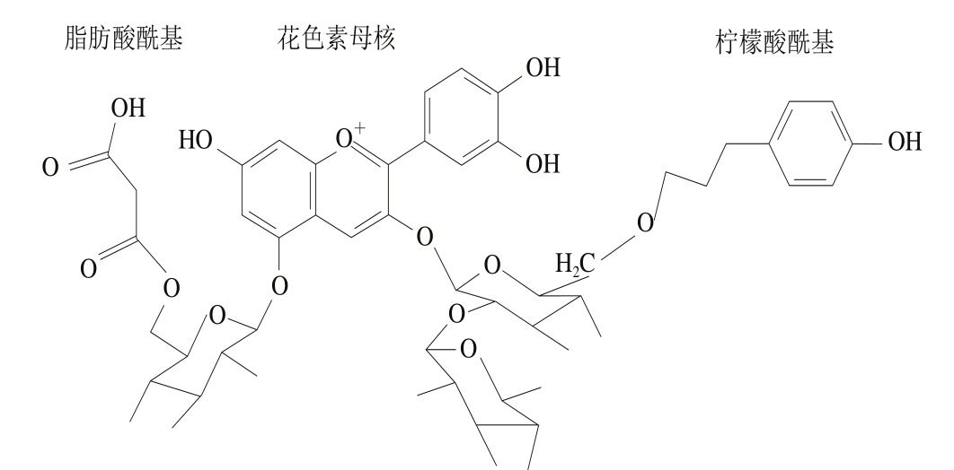 花色苷是植物的主要呈色物质,是植物世界分布最广的一类色素,它能使植物呈现红、蓝等色泽,并具有独特的生理活性功能。研究表明,花色苷具有抗氧化[1-2]、抗衰老[3]、调节血糖[4]、抑制肿瘤[5-6]、修复和保护肝损伤[7]、修复辐射损伤、保护心血管和降血脂等多种生理功效[8-10],应用前景广阔。但由于花色苷本身的活性,在食品加工中稳定性较差[11],易受pH值、温度、光、O2、花色苷种类、金属离子和酶等因素的影响[12-13],限制了花色苷在食品及其加工领域中的应用。因此,扩大天然色素资源花色苷的应用需解决两方面的问题:一是寻找和开发花色苷含量丰富的植物资源;二是研发合适的花色苷结构修饰技术,以提高花色苷的稳定性并保持其生物活性。分子结构修饰可以提高花色苷在外界环境、食品添加剂和食品加工中的稳定性,使其在较大pH值范围内表现出良好的色泽,对于拓展花色苷在食品加工、营养和保健品行业中的应用具有重要的现实意义。然而,对花色苷结构修饰改性方面目前研究报道较少,国外学者对葡萄酒中的吡喃花色苷研究较多,而国内学者则偏向于花色苷的酯基化和酰基化,但研究也处于起步阶段,效果不是很理想。本文就不同类型(酰基修饰、酯基修饰、形成吡喃类衍生物)花色苷结构修饰的原料来源、结构特征及其生理活性进行了综述,为进一步研究花色苷的结构稳定性、生理活性及其在食品加工、食品营养和保健品工业的应用提供借鉴。