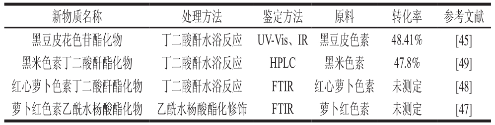 新物质名称 处理方法 鉴定方法 原料 转化率 参考文献黑豆皮花色苷酯化物 丁二酸酐水浴反应 UV-Vis、IR 黑豆皮色素 48.41% [45]黑米色素丁二酸酐酯化物 丁二酸酐水浴反应 HPLC 黑米色素 47.8% [49]红心萝卜色素丁二酸酐酯化物 丁二酸酐水浴反应 FTIR 红心萝卜色素 未测定 [48]萝卜红色素乙酰水杨酸酯化物 乙酰水杨酸酯化修饰 FTIR 萝卜红色素 未测定 [47]