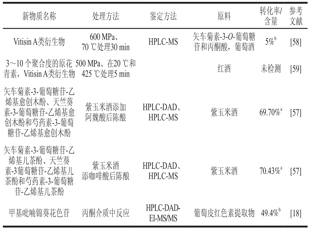 新物质名称 处理方法 鉴定方法 原料 转化率/含量参考文献Vitisin A类衍生物 600 MPa、70 ℃处理30 min HPLC-MS 矢车菊素-3-O-葡萄糖苷和丙酮酸,葡萄酒 5%b [58]3~10 个聚合度的原花青素,Vitisin A类衍生物500 MPa、在20 ℃和425 ℃处理5 min 红酒 未检测 [59]矢车菊素-3-葡萄糖苷-乙烯基愈创木酚、天竺葵素-3-葡萄糖苷-乙烯基愈创木酚和芍药素-3-葡萄糖苷-乙烯基愈创木酚紫玉米酒添加阿魏酸后陈酿HPLC-DAD、HPLC-MS 紫玉米酒 69.70%a[57]矢车菊素-3-葡萄糖苷-乙烯基儿茶酚、天竺葵素-3葡萄糖苷-乙烯基儿茶酚和芍药素-3-葡萄糖苷-乙烯基儿茶酚紫玉米酒添咖啡酸后陈酿HPLC-DAD、HPLC-MS 紫玉米酒 70.43%a[57]甲基吡喃锦葵花色苷 丙酮介质中反应 HPLC-DADEI-MS/MS 葡萄皮红色素提取物 49.4%b [18]