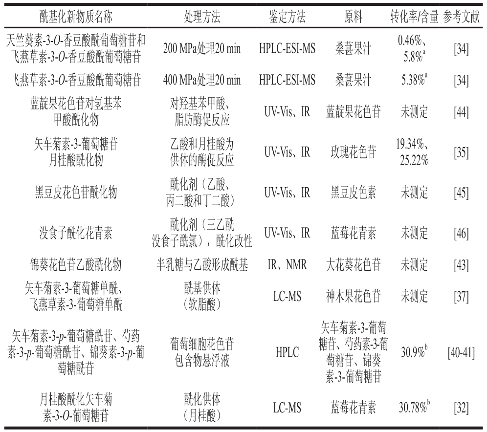 目前,花色苷酰基化修饰的类型、来源及转化率见表2,可知除组织培养外(转化率为30.9%),其他花色苷酰基化的转化率较低,且大部分结构和命名不明确。