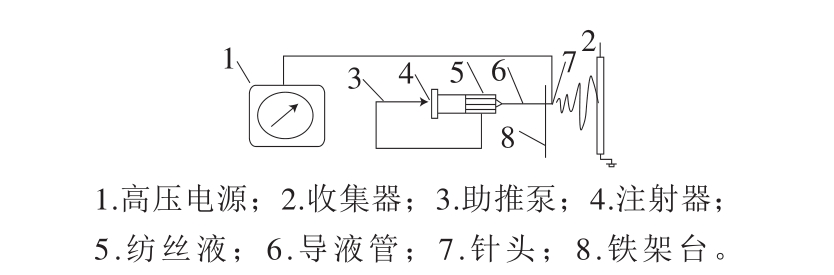 静电纺丝是一种利用高压电场产生的静电力形成射流,并快速固化制备纳米纤维的技术,其中高压电源输出电压为1~30 kV,聚合物溶液通过电场力从一个注射器针头引入收集器中,注射器中的溶液在静电场的作用下开始充电,并形成“泰勒锥”。当静电作用力能够克服液体表面张力的束缚时,“泰勒锥”流体开始喷出,形成射流。在静电作用力、表面张力、注射器推力以及重力等相互作用下,射流开始拉伸并发生旋转。随着溶剂的快速挥发,射流射向收集板并固化形成纳米纤维[44],具体原理见图5。