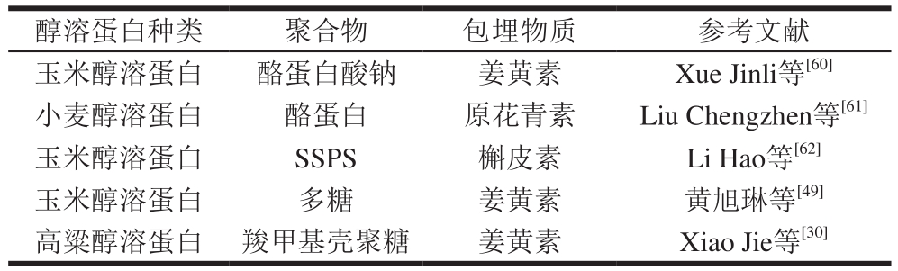 醇溶蛋白种类 聚合物 包埋物质 参考文献玉米醇溶蛋白 酪蛋白酸钠 姜黄素 Xue Jinli等[60]小麦醇溶蛋白 酪蛋白 原花青素 Liu Chengzhen等[61]玉米醇溶蛋白 SSPS 槲皮素 Li Hao等[62]玉米醇溶蛋白 多糖 姜黄素 黄旭琳等[49]高粱醇溶蛋白 羧甲基壳聚糖 姜黄素 Xiao Jie等[30]