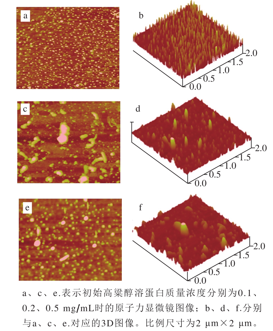 高粱醇溶蛋白是高粱的主要贮存蛋白,约占高粱总蛋白的77%~82%[28]。高粱醇溶蛋白具有良好的生物相容性和可降解性[29],它与玉米醇溶蛋白在结构上有很大的相似性,Xiao Jie等[30]从高粱谷物中提取了高粱醇溶蛋白,其中α、β、γ-高粱醇溶蛋白和交联-高粱醇溶蛋白分别占总高粱醇溶蛋白的68%、14%、6%和12%,并用原子力显微镜观察高粱醇溶蛋白的形态和自组装过程,结果显示:在初始蛋白质量浓度为0.1 mg/mL时,高粱醇溶蛋白以椭球或圆盘状颗粒的形式均匀分散(图3a、b);当初始蛋白质量浓度增加到0.2 mg/mL时,除了单个球形颗粒外,开始出现大的圆盘状和棒状颗粒(图3c、d);当初始蛋白质量浓度进一步增加到0.5 mg/mL时,蛋白颗粒继续聚集,形成更大的圆盘状或杆状结构(图3e、f)。蛋白质的质量浓度和溶剂的极性可以影响高粱醇溶蛋白的自组装,因此通过改变蛋白质量浓度和溶剂极性是调节醇溶性生物材料原纤化的一种简便方式。