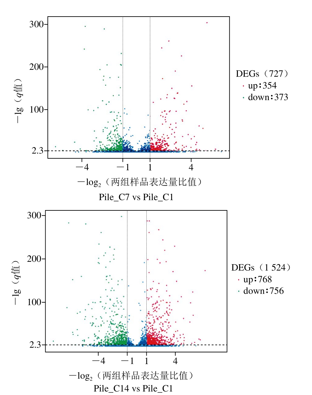 由图4、5可知,Pile_C7与Pile_C1比较,共筛选出727 个差异表达的基因,其中Pile_C7组相对于Pile_C1组上调基因354 个,占总差异表达48.7%,下调基因373 个,占总差异表达51.3%。Pile_C14与Pile_C1比较,共筛选出1 524 个差异表达的基因,其中Pile_C14组相对于Pile_C1组上调基因768 个,占总差异表达50.4%,下调756 个,占总差异表达49.6%。