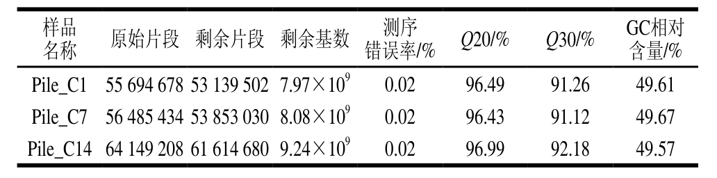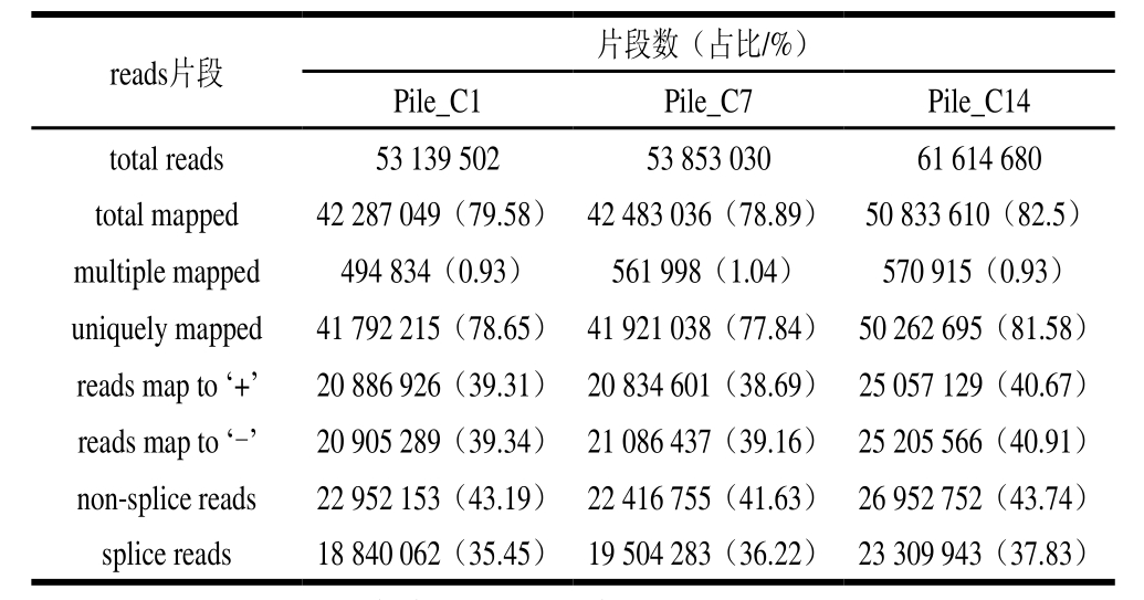由表3可知,Pile_C1、Pile_C7、Pile_C14三组转录组测序获得的clean reads中,能定位到基因组上的reads片段有135 603 695 个,占比78.89%~82.5%,在参考序列上有多个比对位置的reads片段有1 627 747 个,占比0.93%~1.04%,在参考序列上有唯一比对位置的reads片段有133 975 948 个,占比77.84%~81.58%,比对到基因组上正链的reads片段有66 778 656 个,占比38.69%~40.67%,比对到基因组上负链的reads片段有67 197 292 个,占比39.16%~40.91%。能定位到基因组上的reads片段中,分段比对到两个外显子上的reads片段有61 654 288 个,占比35.45%~37.83%,整段比对到外显子的reads片段有72 321 660 个,占比41.63%~43.74%。