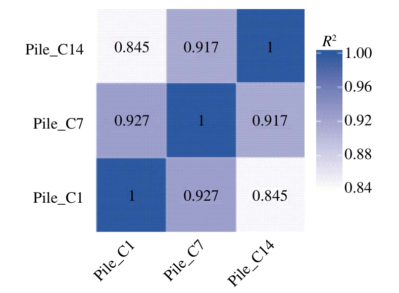 图3 Pile_C1、Pile_C7、Pile_C14三组样品间相关系数