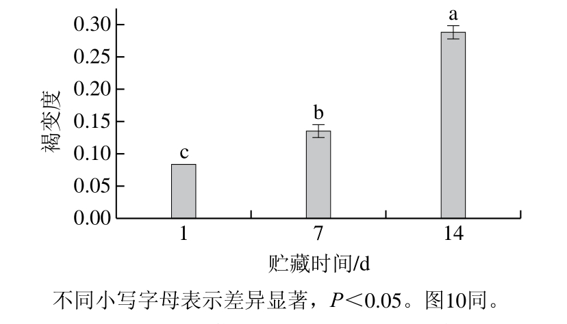 从图10可以看出,双孢蘑菇PPO活性随贮藏时间的延长逐渐增强。Lei Jing等[20]研究结果表明AbPPO1基因表达的影响模式与其对褐变度和PPO活性的影响模式不一致,而AbPPO3基因与褐变度和PPO活性的影响模式一致,认为AbPPO1基因可能不参与双孢蘑菇褐变的形成,AbPPO3参与双孢蘑菇的褐变。PPO是引起双孢蘑菇褐变的主要酶,其主要通过将酚类物质氧化为醌,进一步产生黑色素,从而导致双孢蘑菇褐变的发生。将PPO活性与PPO3基因表达做Pearson相关性分析得到系数为-0.777,表明两者具有一定的相关性,与转录组测序结果具有一致性。Van Leeuwen等[27]研究表明,双孢蘑菇菌盖皮层褐变程度与PPO活性呈正相关关系,与本实验研究结果一致。