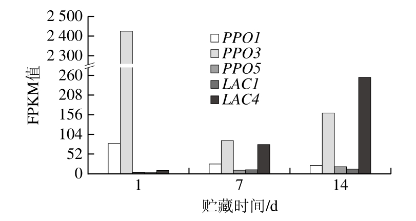 由图9可知,从3 组双孢蘑菇菌盖在不同贮藏时间的差异表达基因中筛选出与多酚氧化酶相关的基因有5 个,这些基因包括多酚氧化酶基因和漆酶基因。其中,PPO3(18 085 507)在贮藏第7天时表达量最低,在贮藏第14天时基因表达量上调,这与Li[2]和Lei Jing[20]等的研究结果一致。PPO1(18 082 695)在贮藏时间表达量下调。LAC4(18 085 498)、PPO5(18 078 406)和LAC1(18 080 537)3 个基因表达量在贮藏期间呈上调趋势,且在第7天和第14天期间基因表达量显著上调。