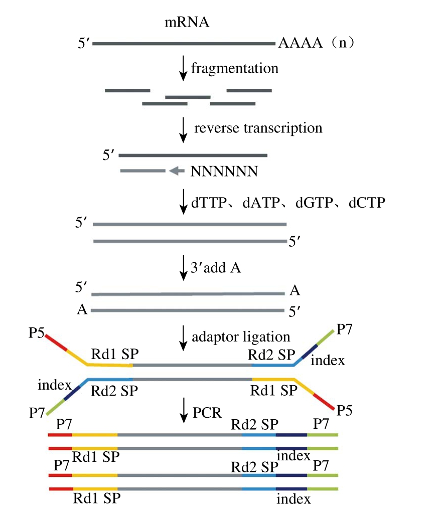 采用Trizol法[21]提取双孢菇菌盖RNA,利用NanoPhotometer®分光光度计检测RNA浓度、OD260 nm/OD280 nm和OD260 nm/OD230 nm值。利用生物分析仪精确检测RNA完整性(用RIN表示)和25S/18S值。RNA样品标准质量浓度不低于250 ng/μL,OD260 nm/OD280 nm值应介于1.8~2.2之间,OD260 nm/OD230 nm值不小于1.8,RIN不低于6.5,25S/18S值不低于1.0。样品检测合格后,由北京诺禾致源科技股份有限公司进行cDNA文库的构建(图1)及高通量测序。