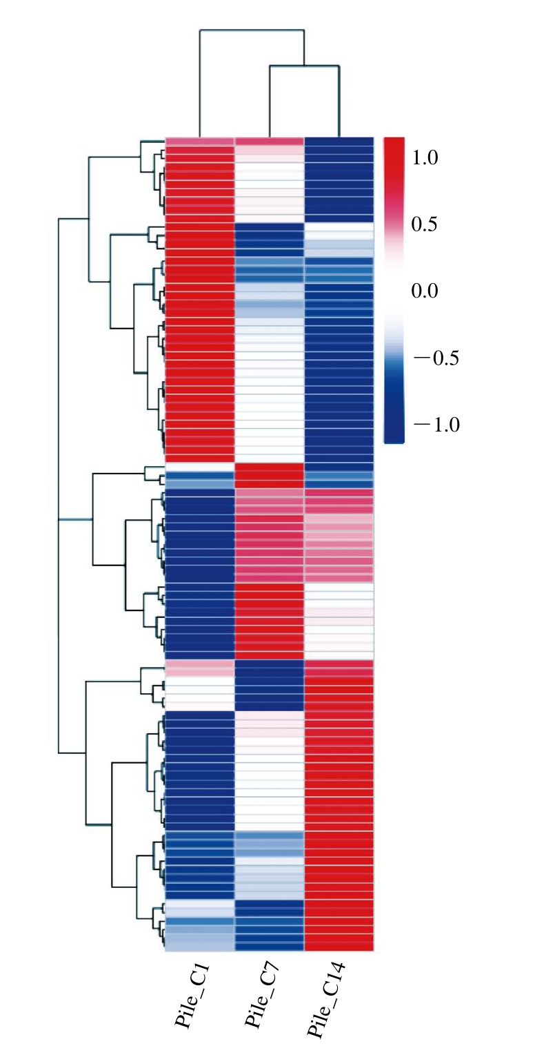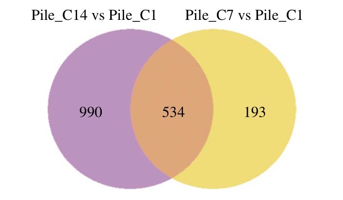 样品间基因表达水平相关性用皮尔逊相关系数的平方(R2)表示。相关系数R2越接近1,表明样品之间表达模式的相似度越高。由图3可知,Pile_C1与Pile_C7间的相关系数R2为0.927,Pile_C1与Pile_C14间的相关系数R2为0.845,Pile_C7与Pile_C14间的相关系数R2为0.917,说明结果可靠且样本选择合理。