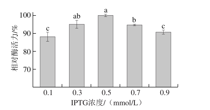 如图4所示,IPTG浓度对Str3p酶活力变化有显著影响(P<0.05),随其浓度的增加,Str3p酶活力呈现先增后降的趋势,其中最适IPTG诱导浓度为0.5 mmol/L,当IPTG浓度过高时,可能会影响菌株生长和蛋白的表达,进而导致Str3p酶活力降低。