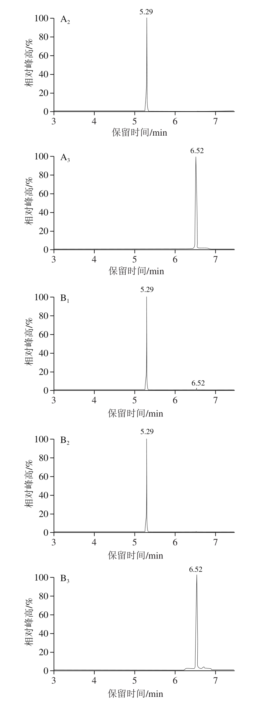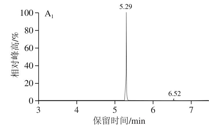 通过考察标准品的出峰情况,同样在相同的保留时间检出上述特征离子,说明反应液中存在这2 种物质。从图8A可以看出,7.4 mmol/L糠醛和49.5 μmol/L糠硫醇的特征离子对分别在5.29 min和6.52 min出峰,图8B是Str3p催化反应液的出峰情况,其定性离子对与标准品出峰保留时间一致,一方面说明定性结果准确可靠,另一方面证实催化反应生成糠硫醇。