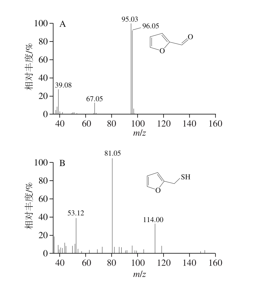 如图7所示,GC-MS分析发现一个保留时间为5.29 min的目标化合物,其离子流图显示特征离子为m/z 95和96,另一个化合物在保留时间为6.52 min处显示的特征离子为m/z 53、81和114,这与NIST谱库中糠醛和糠硫醇的特征离子m/z相匹配。