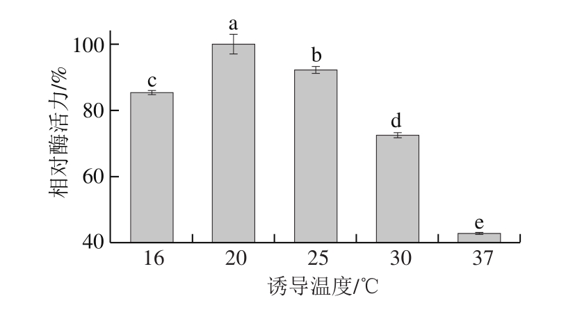 在1.3.7节的培养液中添加IPTG终浓度为0.1、0.3、0.5、0.7、0.9 mmol/L,于16 ℃、150 r/min诱导9 h,收集粗酶液测定酶活力;在培养液中加入终浓度0.5 mmol/L IPTG,控制温度16、20、25、30、37 ℃,150 r/min诱导9 h,收集粗酶液测定酶活力;在培养液中加入终浓度0.5 mmol/L IPTG,于20 ℃、150 r/min分别诱导5、7、9、11、13、15 h,收集粗酶液测定酶活力。