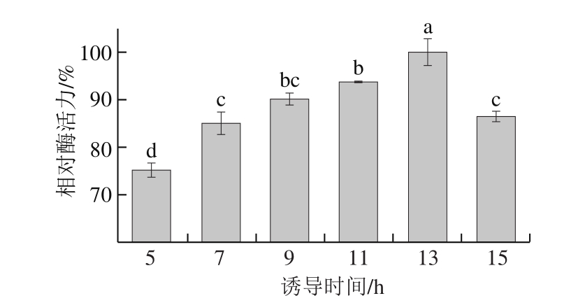 如图6所示,诱导时间对Str3p表达量有显著影响(P<0.05),随诱导时间的延长,Str3p酶活力不断上升,当诱导时间大于13 h时,Str3p酶活力急剧下降,因此认为13 h为适宜的IPTG诱导时间。通常诱导时间短,菌体生长仍处于适应期,蛋白表达量较低,以致酶活力降低。随诱导时间的延长,蛋白表达量增加,但同时可能导致目的蛋白降解及菌体老化,使其得率下降,导致酶活力降低。