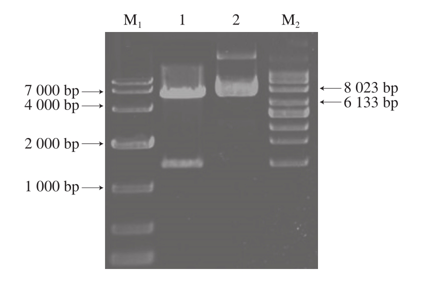 M1. DL 10000 DNA Marker;M2. Supercoiled DNA Ladder Marker;1.重组质粒双酶切;2.重组质粒。