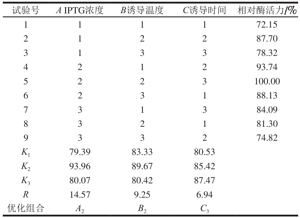 试验号A IPTG浓度B诱导温度C诱导时间 相对酶活力/%1 1 1 1 72.15 2 87.70 3 1 3 3 78.32 1 2 2 4 93.74 5 2 2 3 100.00 2 1 2 6 88.13 7 3 1 3 84.09 2 3 1 8 81.30 9 3 3 2 74.82 3 2 1 K1 79.39 83.33 80.53 K2 93.96 89.67 85.42 K3 80.07 80.42 87.47 R 14.57 9.25 6.94优化组合A2 B2 C3