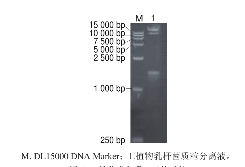 离心收集植物乳杆菌LP3的菌体,用质粒提取试剂盒提取质粒。不同于说明书的步骤是:用含有60 mg/mL溶菌酶的solution I溶液重新悬浮菌体,并在37 ℃温育1 h,以破坏植物乳杆菌细胞壁的肽聚糖层。
