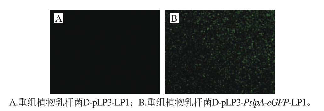 挑取转化后的阳性重组菌D-pLP3-PslpA-eGFP和含空载体D-pLP3的植物乳杆菌LP1接种于MRS液体培养基(含25 μg/mL氯霉素)培养过夜。再将上述过夜培养的菌液按2%的比例接种于适量MRS培养液中,37 ℃培养16 h后,取其菌体制作水浸片,用荧光显微镜观察,x=485 nm、y=533 nm的条件下检测样品的荧光强度。37 ℃培养24 h后取其上清液,表达上清液中的蛋白经60%饱和硫酸铵溶液,6 000 r/min离心10 min,所得沉淀用0.02 mol/L磷酸盐缓冲液重悬浓缩100 倍左右。加入5×蛋白上样缓冲液,沸水中煮10 min,待蛋白充分变性冷却至室温,取适量上清液加至十二烷基硫酸钠-聚丙稀酰胺凝胶电泳(sodium dodecyl sulfate-polyacrylamide gel electrophoresis,SDS-PAGE)凝胶加样孔内,进行常规电泳。