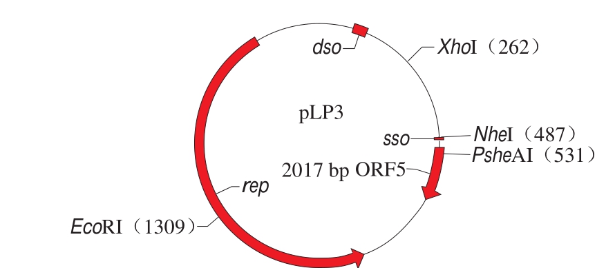 本研究从分离自传统发酵酸菜中的植物乳杆菌LP3中得到一个天然质粒pLP3,该质粒大小为2 017 bp,GC含量为37.48%。进一步通过生物信息学分析质粒pLP3,该质粒编码7 个ORF,其中ORF3(317 个氨基酸)为复制起始蛋白(RepA),ORF5(48 个氨基酸)编码一个未知功能的蛋白。其余ORF在GenBank没有与之相匹配的蛋白,因此质粒pLP3应归为隐蔽性质粒。根据Rep蛋白的同源性,及其该质粒的sso、dso位点以及Rep蛋白的Motifs与pC194家族进行比较,发现与pC194家族的特征相吻合,推测该质粒的复制方式为滚环复制,属于pC194家族。乳杆菌RC型复制质粒因具有宽宿主性质,而得到较广泛地应用[27],由于pLP3质粒为RC型复制质粒,因此该质粒具有宽宿主性质,能在不同类型的乳酸菌内进行复制。质粒pLP3来自食品级的乳酸菌,质粒本身较小,RC型复制质粒宽宿主性质,这些特性利于其构建为适宜的乳酸菌工程载体。