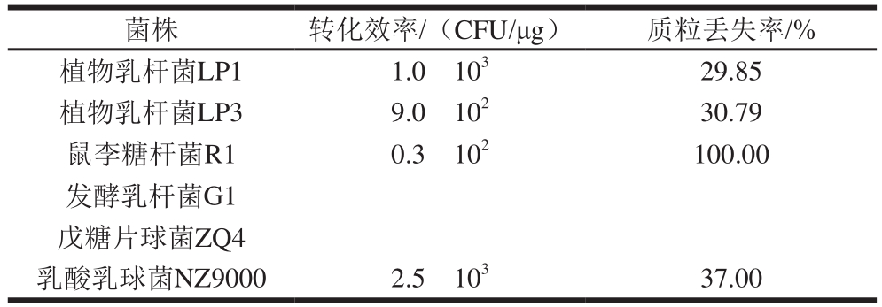 表3 穿梭质粒D-pLP3在不同乳酸菌宿主中的转化效率和稳定性