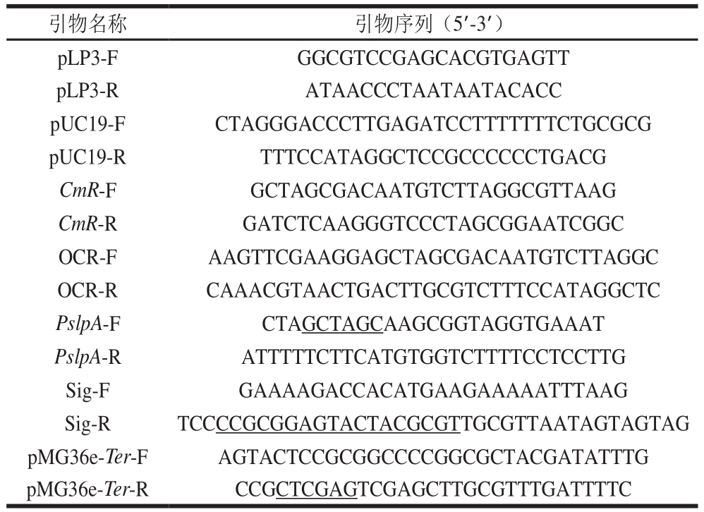 引物名称 引物序列(5’-3’)pLP3-F GGCGTCCGAGCACGTGAGTT pLP3-R ATAACCCTAATAATACACC pUC19-F CTAGGGACCCTTGAGATCCTTTTTTTCTGCGCG pUC19-R TTTCCATAGGCTCCGCCCCCCTGACG CmR-F GCTAGCGACAATGTCTTAGGCGTTAAG CmR-R GATCTCAAGGGTCCCTAGCGGAATCGGC OCR-F AAGTTCGAAGGAGCTAGCGACAATGTCTTAGGC OCR-R CAAACGTAACTGACTTGCGTCTTTCCATAGGCTC PslpA-F CCGCTCGAGTCGAGCTTGCGTTTGATTTTC TCCCCGCGGAGTACTACGCGTTGCGTTAATAGTAGTAG pMG36e-Ter-F AGTACTCCGCGGCCCCGGCGCTACGATATTTG pMG36e-Ter-R CTAGCTAGCAAGCGGTAGGTGAAAT PslpA-R ATTTTTCTTCATGTGGTCTTTTCCTCCTTG Sig-F GAAAAGACCACATGAAGAAAAATTTAAG Sig-R