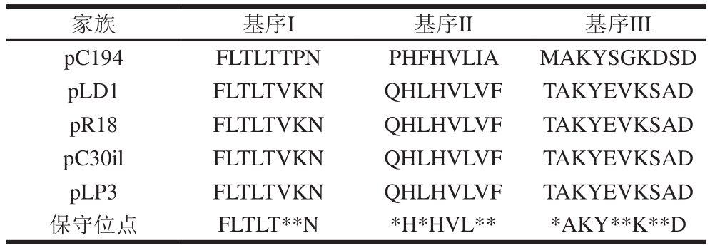 家族 基序I 基序II 基序III pC194 FLTLTTPN PHFHVLIA MAKYSGKDSD pLD1 FLTLTVKN QHLHVLVF TAKYEVKSAD pR18 FLTLTVKN QHLHVLVF TAKYEVKSAD pC30il FLTLTVKN QHLHVLVF TAKYEVKSAD pLP3 FLTLTVKN QHLHVLVF TAKYEVKSAD保守位点 FLTLT**N *H*HVL** *AKY**K**D